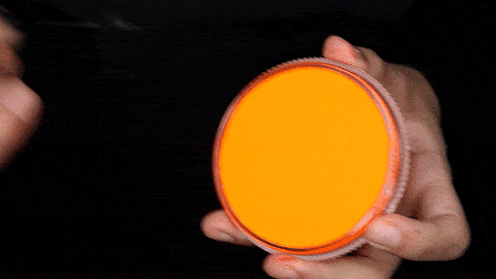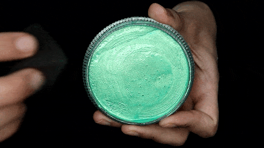 Regular face paints are activated with water. When using a brush, you should get the brush wet with enough water so that you can work up a creamy consistency before using the face paint. One common newbie mistake is not mixing up the face paint and water sufficiently so that when it is applied to the skin, it looks transparent and weak because it's lacking pigment. Especially for white and black, which are used frequently for outlining, it's best to make a small hole in the face paint in which you can mix up a good amount of face paint and water for outlining use. This will help keep you from over-saturating the rest of the face paint.