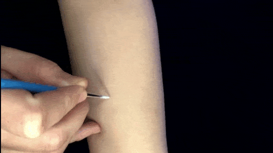 Begin making a teardrop by pressing down with a round bush and then lifting the brush slowly off the skin. You should have a line that begins thick and ends at a nice sharp point. You should also be able to make teardrops thin to thick by beginning with your brush barely touching the skin as you move your brush and gradually pressing down until you stop the stroke at the wide end.