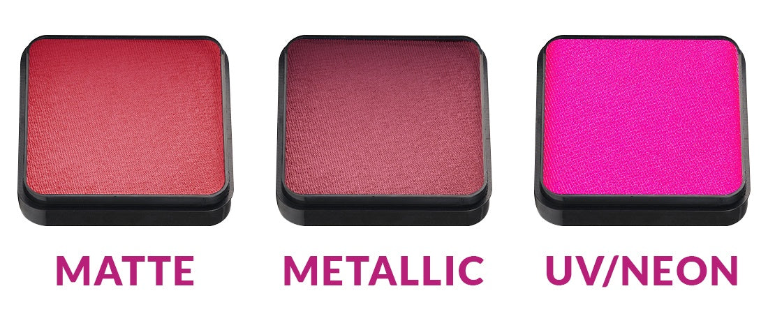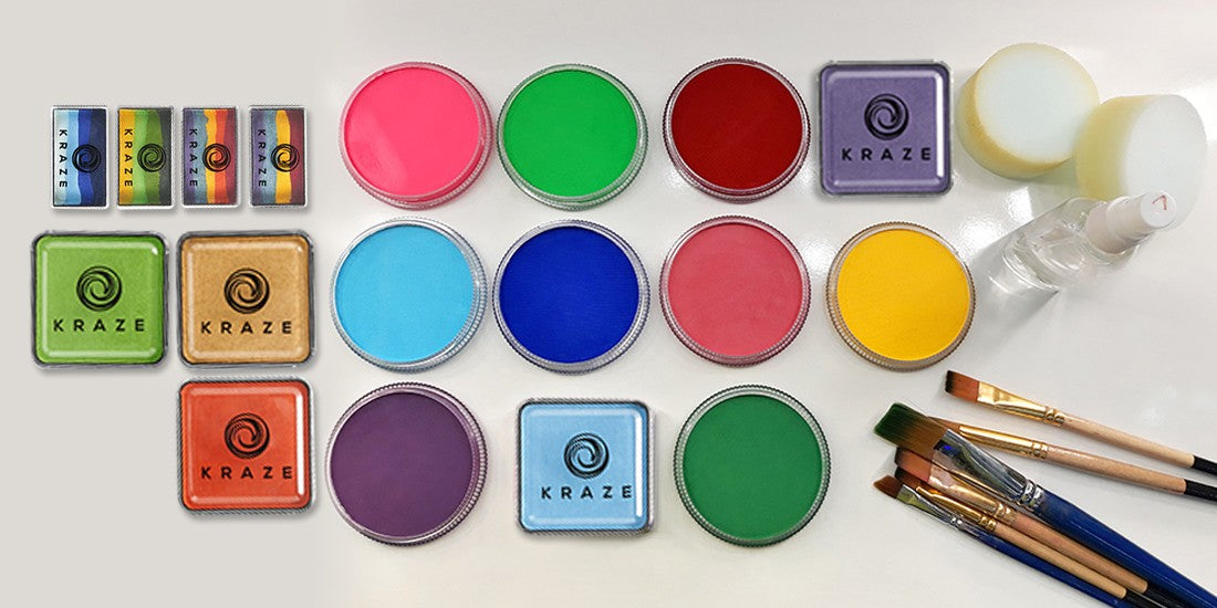 Something else to consider when you are buying face paints is how they can be organized. Kraze FX is a brand of face paint which is designed so that the individual pans stack together. Both single colors and split cake containers are all the same size and stack. The Kraze FX square containers will also line up neatly on your table if you choose not to use a palette case.