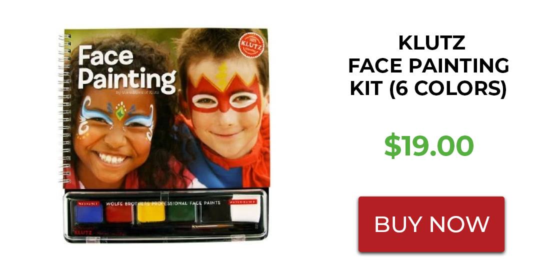 Wolfe FX face paints have been a historical favorite in the face painting industry, so the Klutz Face Painting Kit packs a powerful creative punch with its brilliant water-based makeup. This portable palette contains enough blue, red, yellow, green, black, and white for approximately twenty faces, depending on the designs chosen, as well as one brush for application. As a wax-based paint, Wolfe FX face paints are known for their durability and easy flow from the brush.