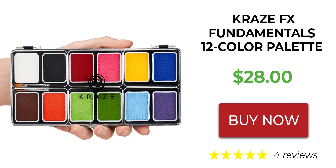 For parents or volunteers who don't normally face paint as professionals, the Kraze Regular Palette pictured below has 12 colors, which are good for approximately 60 designs, and comes with two brushes. Kraze formula is non-toxic, hypoallergenic, vegan, and cruelty-free, making it a safe choice for painting on children. It's all you really need to start.