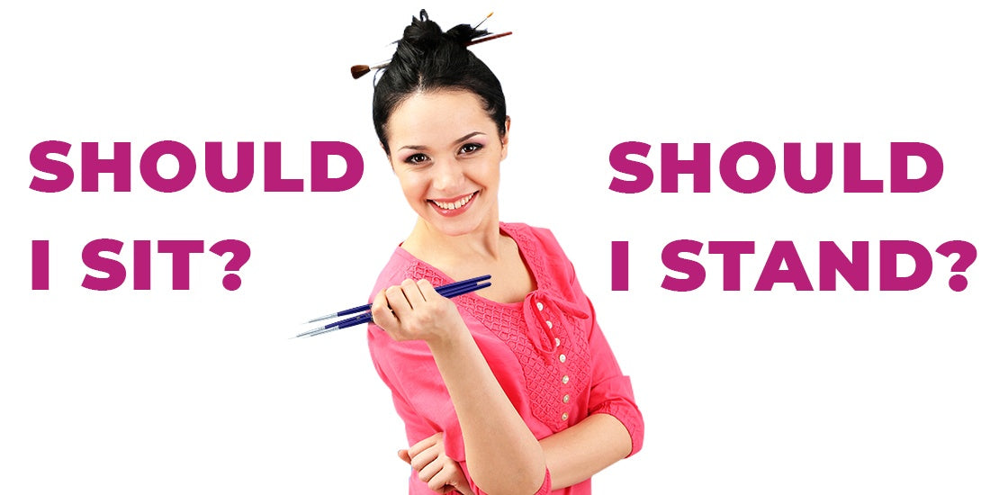 Sitting while painting. For sitting, arrange two chairs so that you can easily reach your supplies and the face of your customer. It's possible having the customer’s chair directly in front of you will feel awkward, and you may have to tip your chair a little bit to reach her face. It may be better to place the customer’s chair parallel to yours so it's less of a stretch for your arms and so you are closer to the person you paint.