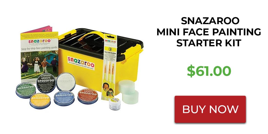 Made with non-toxic, hypoallergenic ingredients which meet the standards for cosmetic safety in the United States, Canada, and Europe, the Snazaroo Mini Face Painting Starter Kit is a great option for fun at home with your own children, or even for larger events as a volunteer. Each Snazaroo kit has six individual 18 milliliter containers of glycerin-based face paint in Bright Red, Sky Blue, White, Grass Green, Bright Yellow, and Black. It's a much larger kit than the Kiutz kit and can do about 300 designs.