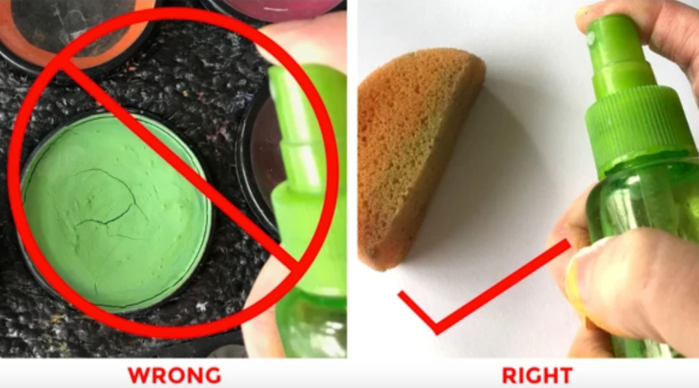 Some artists prefer to barely dip the edge of the sponge in their clear water rather than spraying the sponge, so this is an option as well, but if you do this, make sure to only touch the very tip of the sponge in the water. You don't want too much moisture in your face paint.