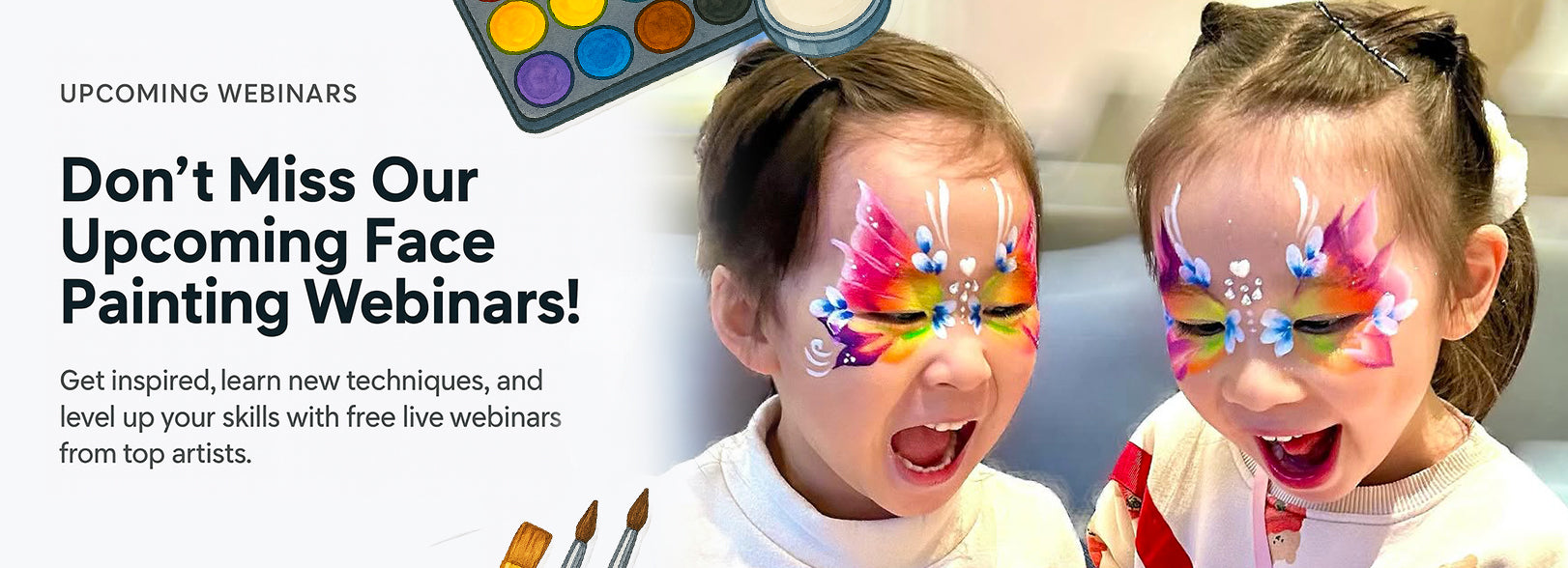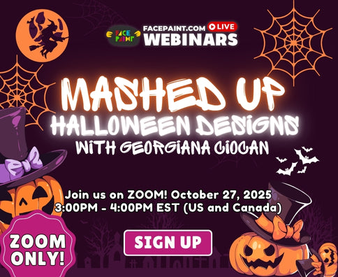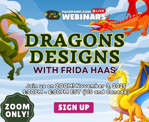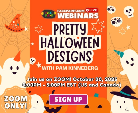 Generally every Monday, FacePaint.com puts on FREE webinars on Zoom Live with some AMAZING face painting artists from around the globe. To sign up for our webinars, please click on the image below to sign up on Zoom.
